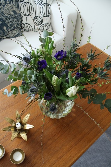 Vi dukade upp smoothie, äppeljuice, fruktsallad med kardemummasmetana, grön sallad, brytbröd, chokladbollar med lingonpulver och blåbärsmuffels (våfflor gjorda av muffinssmet). Supergott alltihopa och en aningens fräschare än köttbullar och sill!