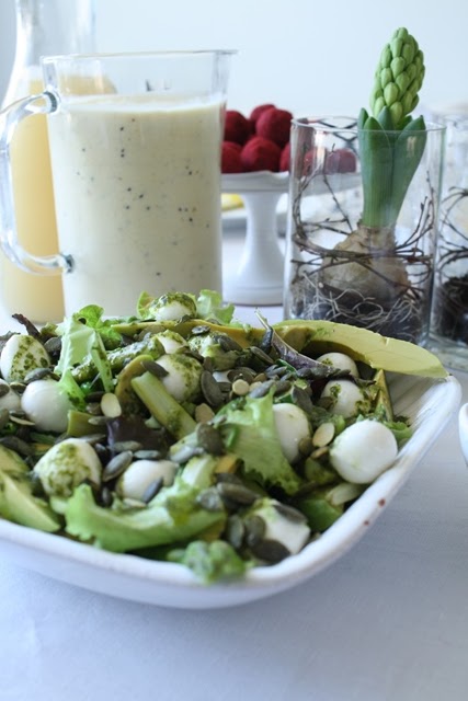 En grön sallad gjord på blandsallad, sparris, avocado, sojabönor, pumpakärnor, mozarellabollar och basilikaolja.