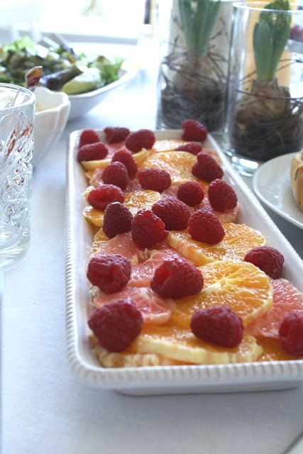 En enkel fruktsallad bestående av apelsiner, blodgrape och hallon. Till den serverade jag smetana smaksatt med kardemumma. Funkar väldigt bra med den lite feta krämen till de syrliga citrusfrukterna. Tack vännen M för det tipset!